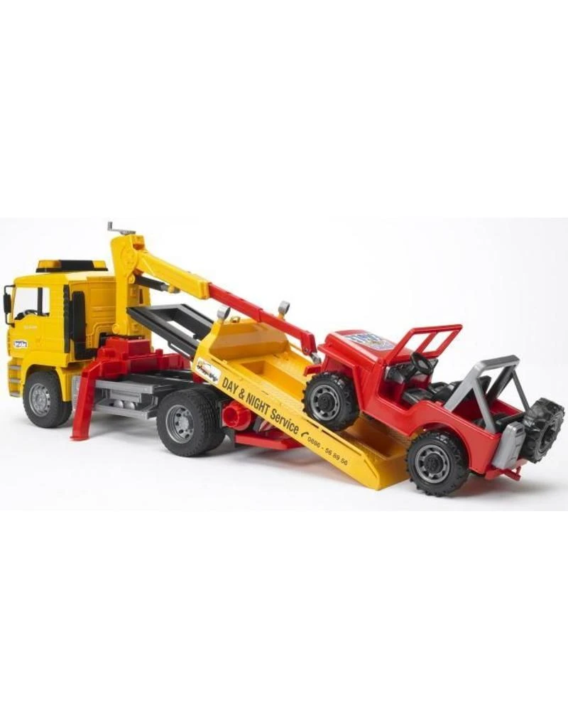De vrachtwagen is een gele MAN met laadkraan, steunpoten en te scharnieren oprijdek. Je kunt dus auto’s optakelen of met de haak erop trekken.