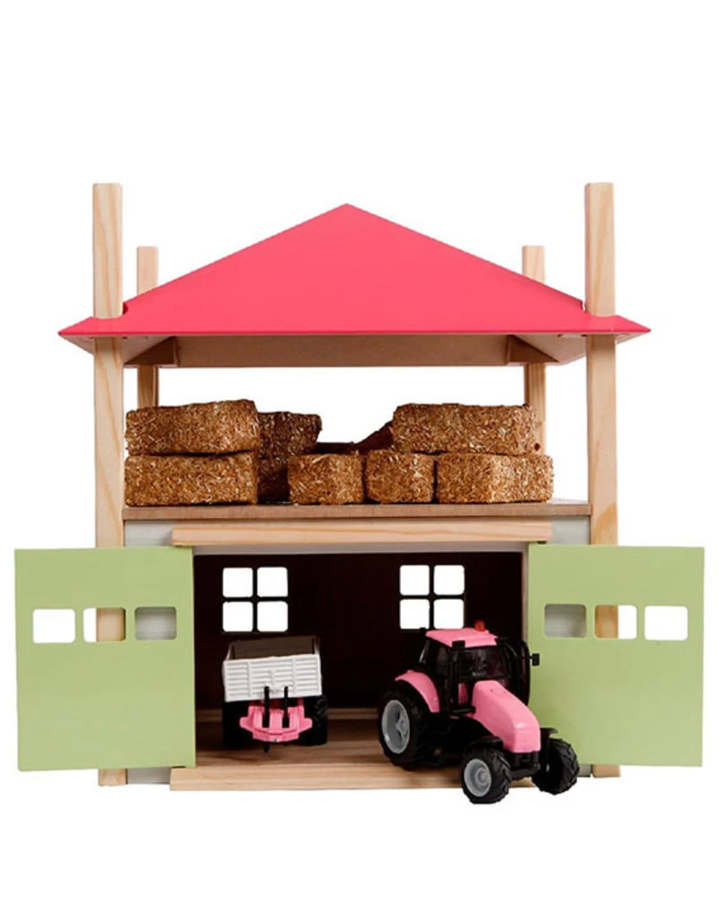 De hooiberg is helemaal van hout gemaakt. De kleuren zijn lekker fel met een roze dak en felgroene deuren en ramen. De deuren van de berging onder kunnen natuurlijk dicht om je paardentailer of aanhanger in te parkeren.