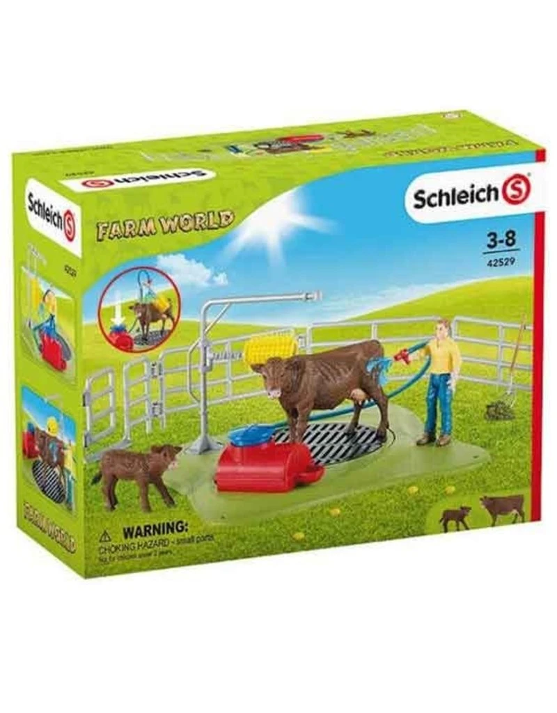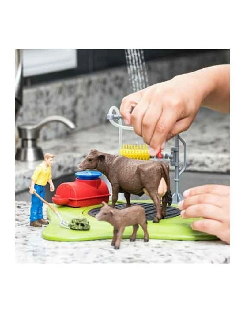 Wil je je koeien eens lekker verwennen. Poets en was ze dan met deze handige wasplaats. Dit farm world item is compleet geleverd met de koe en kalf, wasborstel en hekjes. Plaats je Schleich koe op de roosters en met het bijgeleverde figuur is je gelijk beginnen.