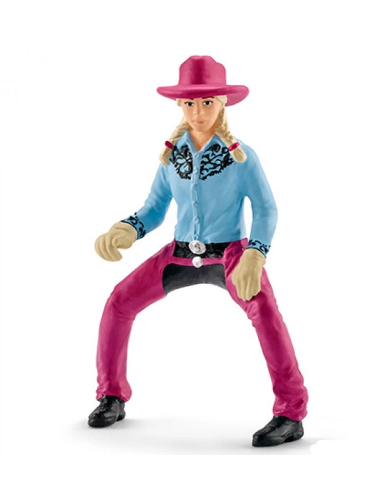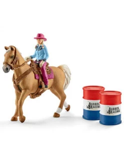 Deze set bestaat uit een paard inclusief western zadel en hoofdstel. De amazone is gekleed in cowboy kleding en klaar voor de wedstrijd.