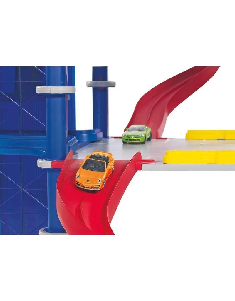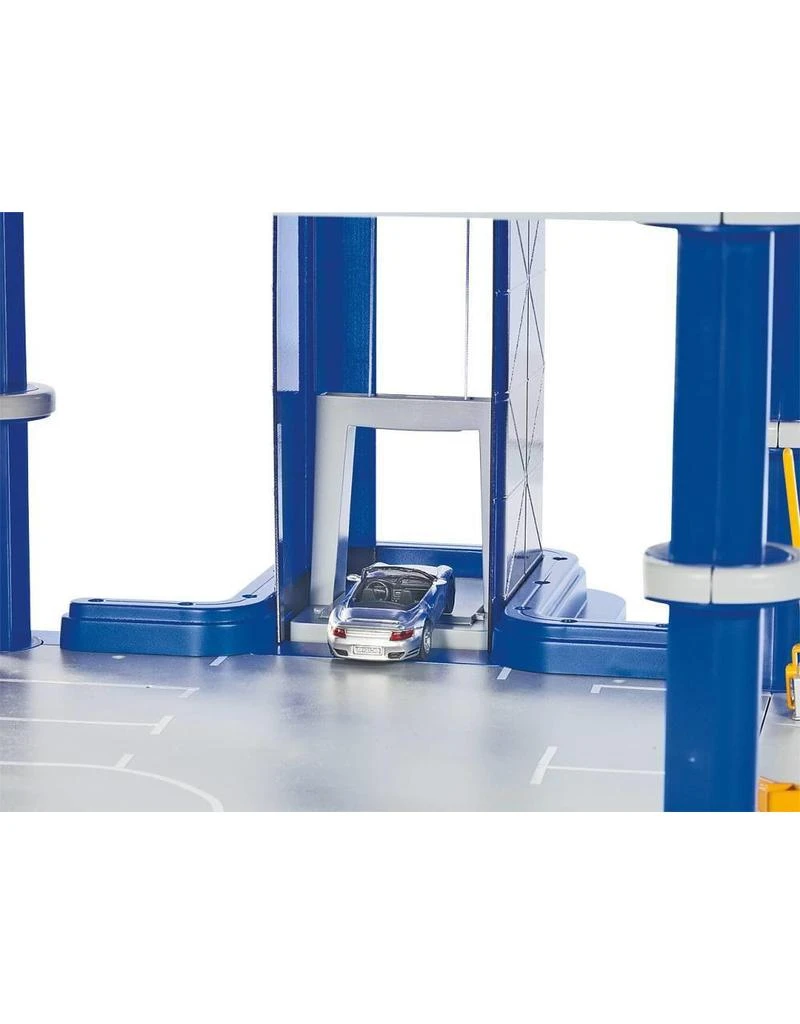 De parkeergarage torent met drie verdiepingen boven de SIKUWORLD uit en zet vrolijke kleuraccenten in de SIKU speelwereld in de kinderkamer. De garage kan probleemloos in de SIKUWORLD worden geïntegreerd maar ook zelfstandig worden gebruikt. De in de set meegeleverde oranje Porsche cabrio glijdt met de lift omhoog en zoekt een plekje in de ruime en genummerde parkeerboxen. Het uitrijden verloopt vlot omdat het voertuig zonder tussenstop van de bovenste verdieping tot aan de slagbomen bij de uitgang kan rijden. De in de afritten geïntegreerde unieke SIKUSlide-Line maakt vlot uitrijden mogelijk voor SIKU voertuigen met rubberbanden.