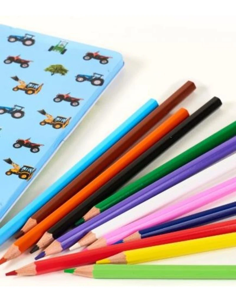 Een set van 12 kwaliteitskleurpotloden ingepakt in een slim Tractor Ted-presentatiedoos, gedecoreerd met Tractor Ted Big Machine-ontwerp (boven) en Tractor Ted-ontwerp (binnenkant). Inclusief Tractor Ted-afbeelding aan de binnenkant!